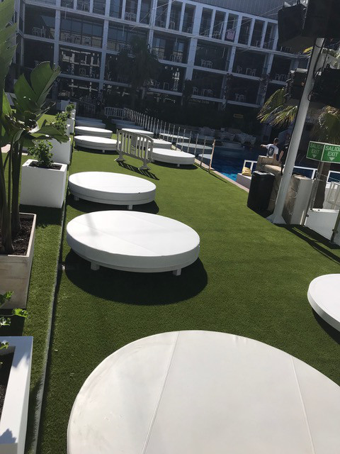 Easigrass brought a touch of grass to the party at Ibiza Rocks Hotel, one of the Balearic Islands’ most famous poolside live music venues. More than 700m2 of Easi-Knightsbridge grass was installed around the pool, throughout the VIP lounge and balcony areas of the iconic hotel music venue, which attracts some of the world’s most popular music acts to its stage.